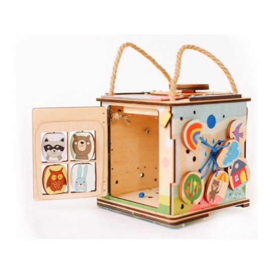 Activity board kostka so zábavnými a montessori prvkami nadchne dievčatá aj chlapcov. Jednoducho prenášateľná kostka si pre deti pripravila logické aj zábavné hry, ktoré deti zabavia a zdokonalia ich zručnosti. Každá strana activity board kostky je originálna a prináša iné dobrodružstvá. Na vrchnú strane kostky nájdete veľký slniečkový vypínač, s jeho pomocou kostku rozsvietite. Activity kostka na cesty je montessori hračkou aj nočným svetielkom (promítačkou).