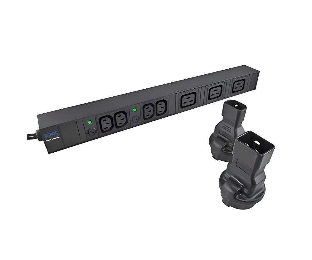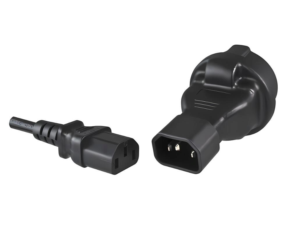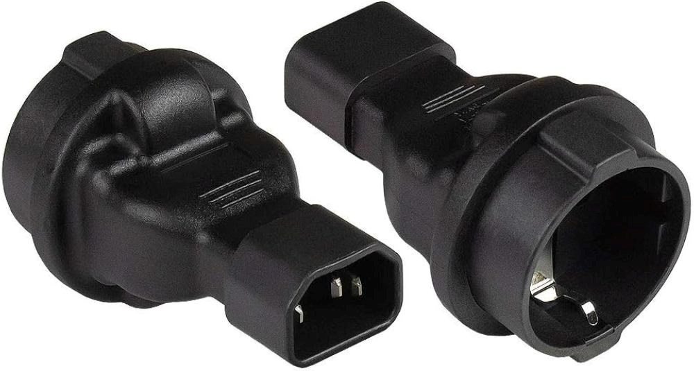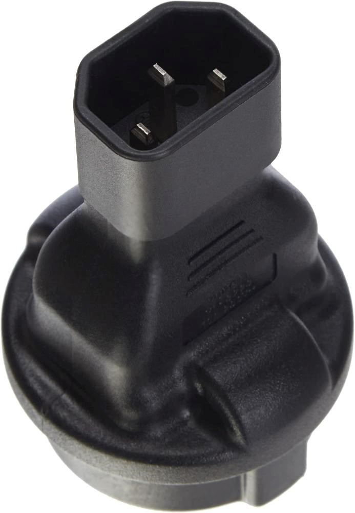 Napájací adaptér v čiernom prevedení pre UPC, s vstupným konektorom IEC C14 (max. 10 A) a výstupnou zásuvkou SCHUKO CEE 7/3 (max. 16 A). Výstupná zásuvka je rovná, nemeckého typu, s ochrannými náramkami po stranách, vhodná na pripojenie vidlíc vybavených zemniacimi náramkami. Je veľmi dôležité zabezpečiť, aby prúd odobraný zo zásuvky nikdy neprekročil 10 A, aby nedošlo k preťaženiu vstupného konektora C14.