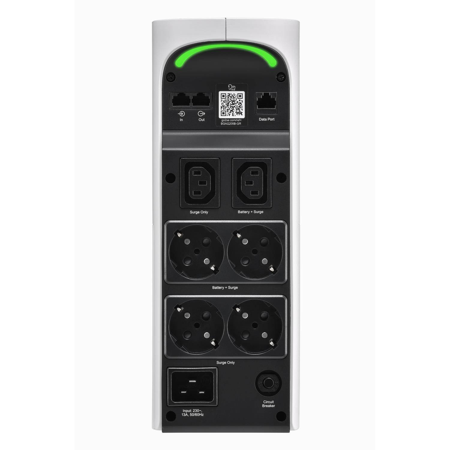 Vežová UPS 2200VA/1320W má celkom 6 zásuviek, z ktorých 3 sú záložné batérie a prepäťová ochrana a 3 sú iba prepäťovou ochranou. Má nárazovú energiu 1080 joulov. Je vybavená automatickou reguláciou napätia, ktorá koriguje poklesy a rázy napätia na správnu úroveň. Dodáva sa s PowerChute Serial Shutdown, ľahko použitým softvérom pre bezpečné vypnutie systému s funkciami správy napájania a energie. Táto UPS má 3-ročnú záruku a politiku ochrany pripojeného zariadenia vo výške 150 000 USD. Má 2 USB porty (Typ A + C) pre chytré nabíjanie osobných zariadení.