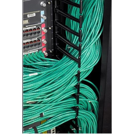 dvojdielne sekcie na správu káblov majú na každej pozícii 1U hladké plastové výstupky, ktoré umožňujú riadny vstup a výstup prepojovacích káblov.