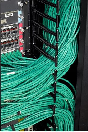 dvojdielne sekcie na správu káblov majú na každej pozícii 1U hladké plastové výstupky, ktoré umožňujú riadny vstup a výstup prepojovacích káblov.