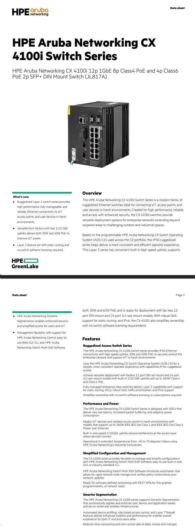 | Aruba 4100i 12-port 1GbE (8-port Class 4 POE and 4-port Class 6 POE) 2-port SFP+ DIN Mount Switch (JL817A) | ||