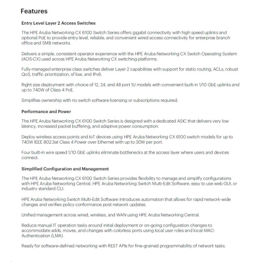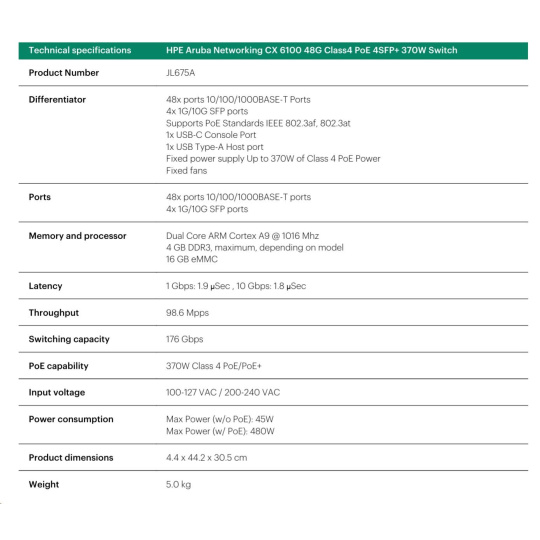 | Aruba 6100 48G Class4 PoE 4SFP+ 370W Switch (JL675A)) | |