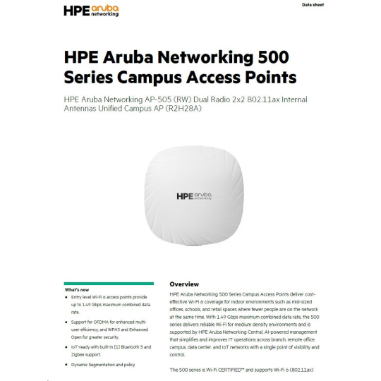 The HPE Aruba 500 Series delivers affordable, high-performance Wi-Fi 6 for schools, midsize offices, and retailers. With up to 1.49 Gbps real-world speed, it supports mobile, IoT, and demanding user needs.
