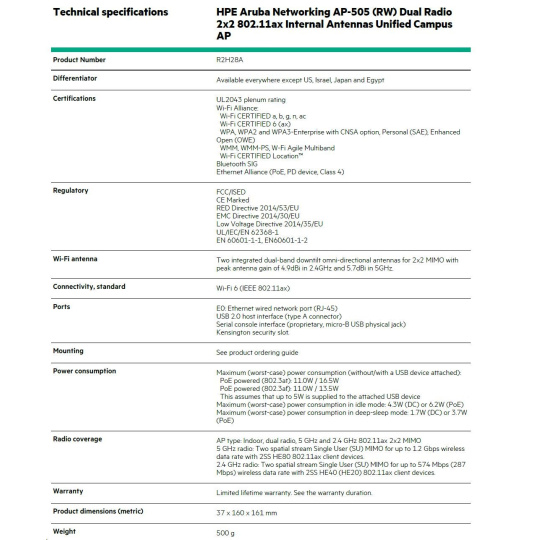 Technical specifications HPE Aruba Networking AP-505 (RW) Dual Radio 2x2 802.11ax Internal Antennas Unified Campus AP Product Number R2H28A Differentiator Available everywhere except US, Israel, Japan and Egypt Certifications UL2043 plenum rating Wi-Fi Alliance: Wi-Fi CERTIFIED a, b, g, n, ac Wi-Fi CERTIFIED 6 (ax) WPA, WPA2 and WPA3-Enterprise with CNSA option, Personal (SAE), Enhanced Open (OWE) WMM, WMM-PS, W-Fi Agile Multiband Wi-Fi CERTIFIED Location™ Bluetooth SIG Ethernet Alliance (PoE, PD device, Class 4) Regulatory FCC/ISED CE Marked RED Directive 2014/53/EU EMC Directive 2014/30/EU Low Voltage Directive 2014/35/EU UL/IEC/EN 62368-1 EN 60601-1-1, EN60601-1-2 Wi-Fi antenna Two integrated dual-band downtilt omni-directional antennas for 2x2 MIMO with peak antenna gain of 4.9dBi in 2.4GHz and 5.7dBi in 5GHz. Connectivity, standard Wi-Fi 6 (IEEE 802.11ax) Ports E0: Ethernet wired network port (RJ-45) USB 2.0 host interface (type A connector) Serial console interface (proprietary, micro-B USB physical jack) Kensington security slot. Mounting See product ordering guide Power consumption Maximum (worst-case) power consumption (without/with a USB device attached): PoE powered (802.3at): 11.0W / 16.5W PoE powered (802.3af): 11.0W / 13.5W This assumes that up to 5W is supplied to the attached USB device Maximum (worst-case) power consumption in idle mode: 4.3W (DC) or 6.2W (PoE) Maximum (worst-case) power consumption in deep-sleep mode: 1.7W (DC) or 3.7W (PoE) Radio coverage AP type: Indoor, dual radio, 5 GHz and 2.4 GHz 802.11ax 2x2 MIMO 5 GHz radio: Two spatial stream Single User (SU) MIMO for up to 1.2 Gbps wireless data rate with 2SS HE80 802.11ax client devices. 2.4 GHz radio: Two spatial stream Single User (SU) MIMO for up to 574 Mbps (287 Mbps) wireless data rate with 2SS HE40 (HE20) 802.11ax client devices. Warranty Limited lifetime warranty. See the warranty duration. Product dimensions (metric) 37 x 160 x 161 mm Weight 500 g