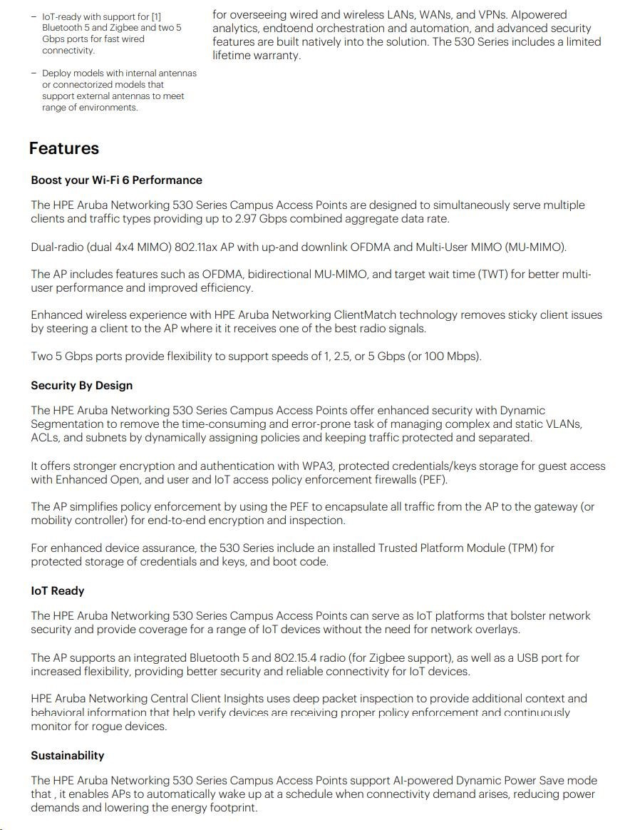 | Aruba Secure Infrastructure The Aruba 530 Series includes components of Aruba's 360 Secure Fabric to help protect user authentication and wireless traffic. Select capabilities include: |