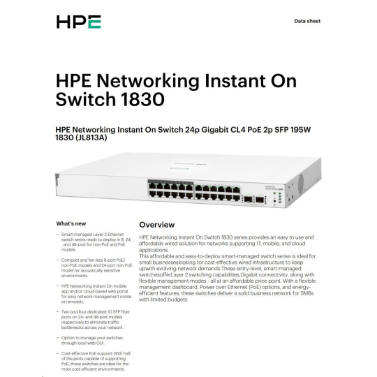 HPE Networking Instant On Switch 24p Gigabit CL4 PoE 2p SFP 195W 1830 (JL813A)