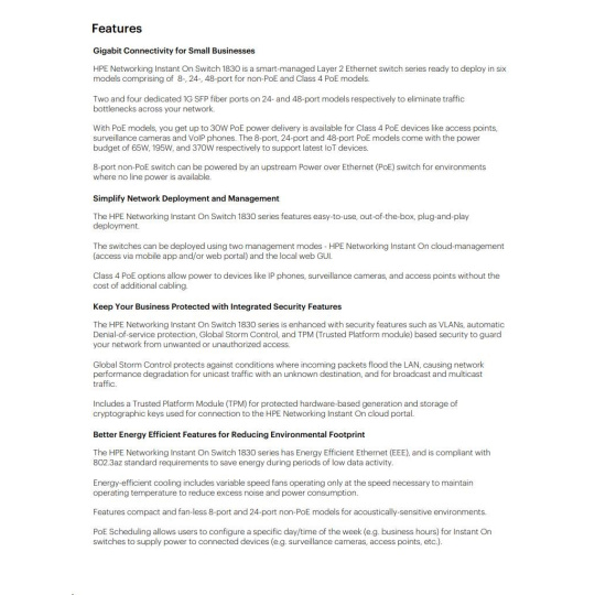 | Aruba Instant On 1830 8G Switch (JL810A) | Aruba Instant On 1830 8G 4p Class4 PoE 65W Switch (JL811A) | Aruba Instant On 1830 24G 2SFP Switch (JL812A) | Aruba Instant On 1830 24G 12p Class4 PoE 2SFP 195W Switch (JL813A) | Aruba Instant On 1830 48G 4SFP Switch (JL814A) | Aruba Instant On 1830 48G 24p Class4 PoE 4SFP 370W Switch (JL815A) | ||||||||