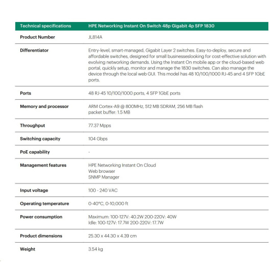 | Aruba Instant On 1830 8G Switch (JL810A) | Aruba Instant On 1830 8G 4p Class4 PoE 65W Switch (JL811A) | Aruba Instant On 1830 24G 2SFP Switch (JL812A) | Aruba Instant On 1830 24G 12p Class4 PoE 2SFP 195W Switch (JL813A) | Aruba Instant On 1830 48G 4SFP Switch (JL814A) | Aruba Instant On 1830 48G 24p Class4 PoE 4SFP 370W Switch (JL815A) | ||||||||
