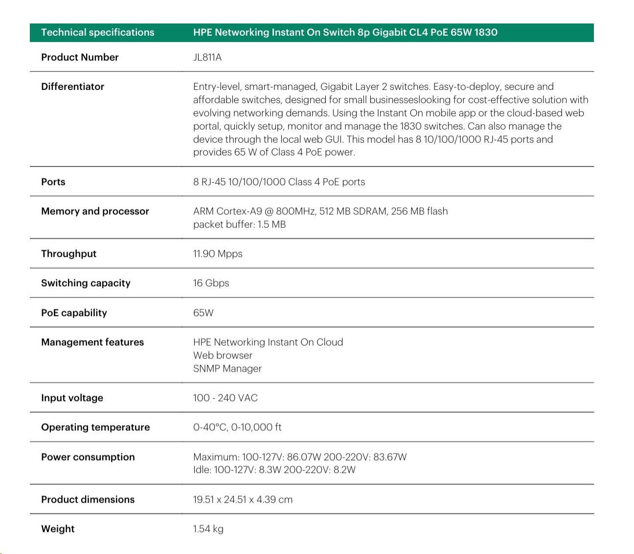 | Aruba Instant On 1830 8G Switch (JL810A) | Aruba Instant On 1830 8G 4p Class4 PoE 65W Switch (JL811A) | Aruba Instant On 1830 24G 2SFP Switch (JL812A) | Aruba Instant On 1830 24G 12p Class4 PoE 2SFP 195W Switch (JL813A) | Aruba Instant On 1830 48G 4SFP Switch (JL814A) | Aruba Instant On 1830 48G 24p Class4 PoE 4SFP 370W Switch (JL815A) | ||||
