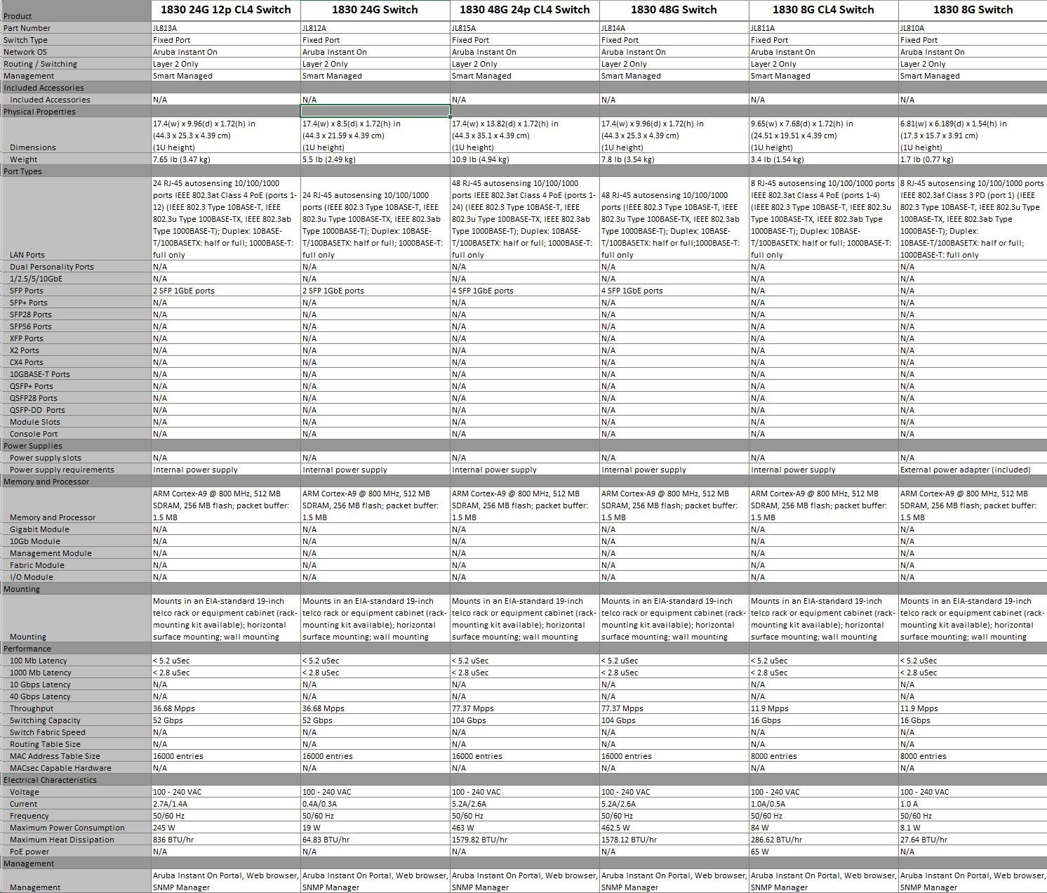 | Aruba Instant On 1830 8G Switch (JL810A) | Aruba Instant On 1830 8G 4p Class4 PoE 65W Switch (JL811A) | Aruba Instant On 1830 24G 2SFP Switch (JL812A) | Aruba Instant On 1830 24G 12p Class4 PoE 2SFP 195W Switch (JL813A) | Aruba Instant On 1830 48G 4SFP Switch (JL814A) | Aruba Instant On 1830 48G 24p Class4 PoE 4SFP 370W Switch (JL815A) | ||||||||