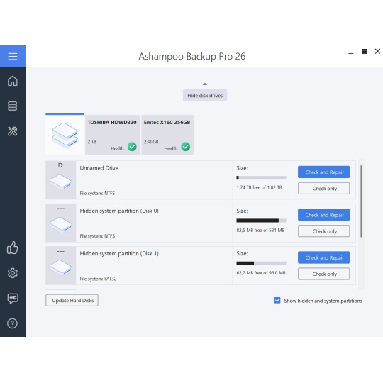 Záloha je len taká bezpečná, ako pevný disk, na ktorom je uložená! Preto Ashampoo® Backup Pro monitoruje parametre S.M.A.R.T. vášho pevného disku počas zálohovania, aby zistil budúce problémy skôr, ako sa vyskytnú! To vám dáva čas reagovať a zabrániť strate údajov. Program je tiež vybavený prídavnou kontrolou diskov/oddielov, ktorá analyzuje a opravuje jednotlivé sektory. Či už ide o interný alebo externý disk, Ashampoo® Backup Pro sa o vaše pevné disky postará mimoriadne dobre!