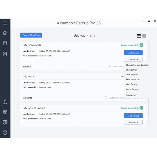 Ashampoo Backup Pro 26 vás zbaví strachu z vírusov, ransomvéru a hardvérových chýb! Vyskúšajte ľahko použiteľné, dobre navrhnuté a zároveň výkonné riešenie zálohovania. Nový Ashampoo Backup Pro vám ponúka všetky možné možnosti ukladania: Zálohujte jednotlivé súbory alebo celé oddiely na lokálne disky alebo u poskytovateľov online úložísk. Zálohovací softvér nemôže byť jednoduchší. Stačí zapojiť úložné zariadenie a môžete začať! Okrem toho je program efektívny z hľadiska zdrojov, neprekáža vám a všetku ťažkú prácu vykonáva na pozadí. Obnovenie záloh je veľmi jednoduché! Ashampoo Backup Pro dokonca prichádza so systémom záchrany pri spustení na obnovenie systému v prípade závažného zlyhania systému!