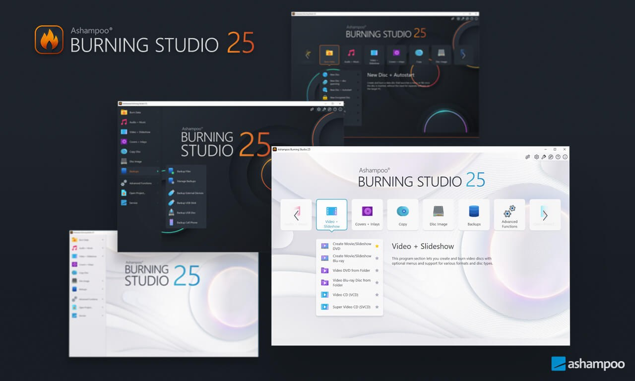 Nové Ashampoo Burning Studio 26 predstavuje najpohodlnejší spôsob bezpečného vypalovania dát a kopírovania diskov CD, DVD a Blu-ray bez námahy. Ripujte audio disky a zálohujte svoju hudbu alebo vytvárajte vlastné hudobné kompilácie s vhodnými obalmi! Ďalšie špičkové multimediálne funkcie vám tiež umožnia vytvárať vlastné filmy a prezentácie, a dokonca ich vypáliť na disk spolu so šikovnými animovanými ponukami. Rozlúčte sa so stratou dát, okamžite zálohujte svoje súbory a vypáľte dôležité dáta na akýkoľvek typ disku pomocou výkonného kompresie a ochrany heslom. A nové komfortné funkcie pre audioknihy, audioprojekcie a podcasty sú zárukou kvalitnej zábavy!