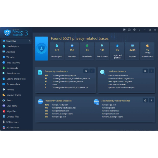 Ashampoo Privacy Inspector se vrátil, nyní robustnější a všestrannější než kdy dříve! Mějte komplexní kontrolu nad svými daty a zařízeními: Výkonná vyhledávací funkce odhaluje uložené informace a podezřelý obsah, zatímco přehled USB zařízení poskytuje přesné podrobnosti o tom, kdy a jaký hardware byl k vašemu počítači připojen. ADS Scanner navíc odhalí neviditelné datové toky.