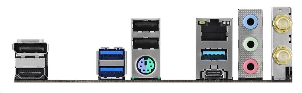 | Vstupy/výstupy na zadnom paneli | - 2 x porty antény - 1 x port myši/klávesnice PS/2 - 1 x port HDMI - 1 x port DisplayPort 1.4 - 2 x USB 2.0 Porty (podporuje ochranu proti ESD) - 3 x USB 3.2 porty typu A Gen1 (podporuje ochranu proti prepätiu) - 1 x USB 3.2 porty typu C Gen1 (podporuje ochranu proti ESD) - 1 x port RJ-45 LAN s LED diódou (ACT/LINK LED a SPEED LED) - HD audio konektory: Line in / predný reproduktor / mikrofón |