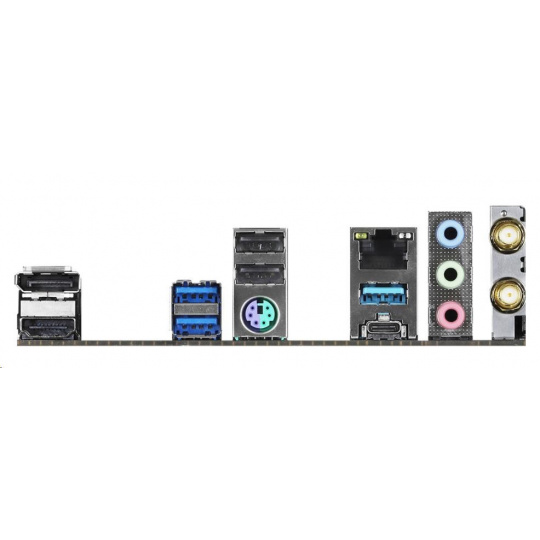 | Vstupy/výstupy na zadnom paneli | - 2 x porty antény - 1 x port myši/klávesnice PS/2 - 1 x port HDMI - 1 x port DisplayPort 1.4 - 2 x USB 2.0 Porty (podporuje ochranu proti ESD) - 3 x USB 3.2 porty typu A Gen1 (podporuje ochranu proti prepätiu) - 1 x USB 3.2 porty typu C Gen1 (podporuje ochranu proti ESD) - 1 x port RJ-45 LAN s LED diódou (ACT/LINK LED a SPEED LED) - HD audio konektory: Line in / predný reproduktor / mikrofón |