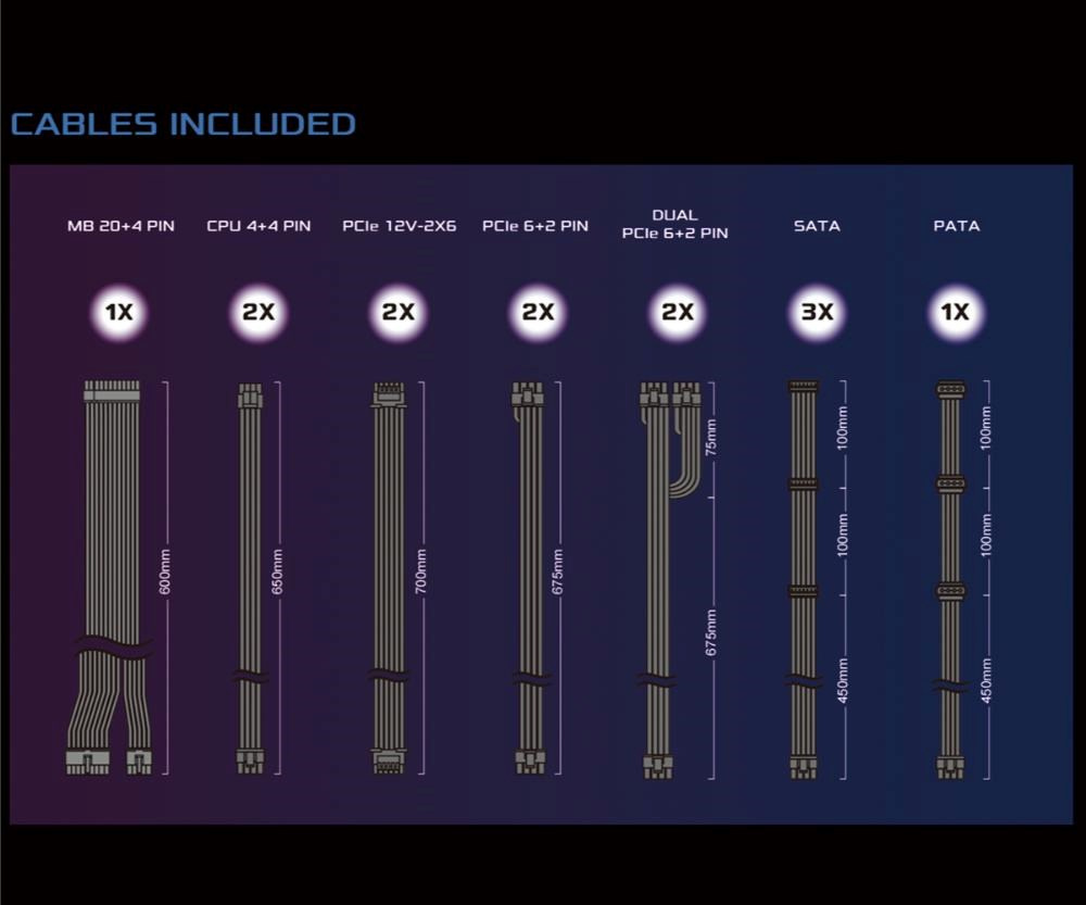 | Dvojitý PCIe 6+2 Pin Konektor | 2x / 2x (675 + 75 mm) |