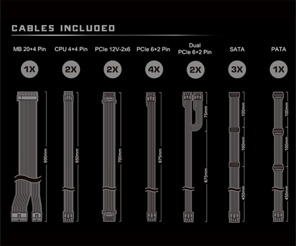 | Dvojitý PCIe 6+2 Pin Konektor | 2x / 2x (675 + 75 mm) |