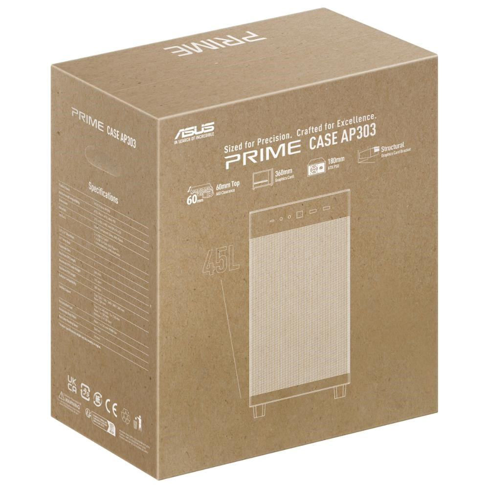 ASUS Prime AP303 je kompaktná ATX skrinka s objemom 44 litrov, ktorá podporuje grafické karty až do dĺžky 360 mm, radiátory do 360 mm a hrúbky do 60 mm a ATX zdroje až do dĺžky 180 mm.