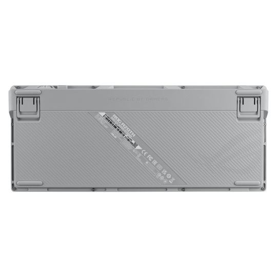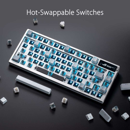 Zakázková herná klávesnica ROG Azoth s tvarovým faktorom klávesnice 75, tesnením, trojvrstvou tlmiacou penou a kovovým horným krytom, vysoko prispôsobiteľná s predom namazanými mechanickými spínačmi ROG NX vymeniteľnými za chodu, stabilizátory klávesnice ROG, kryty kláves PBT doubleshot a mazacou sadou, tri režimy pripojenia s technológiou SpeedNova na 2,4 GHz, OLED displejom, trojcestným ovládacím gombíkom, tromi uhlami náklonu a podporou Mac