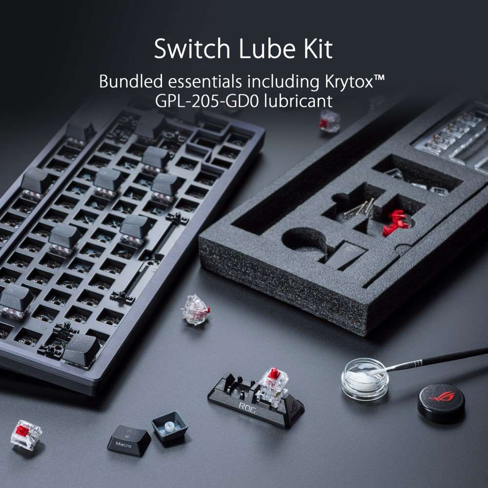 Zakázková herná klávesnica ROG Azoth s tvarovým faktorom klávesnice 75, tesnením, trojvrstvou tlmiacou penou a kovovým horným krytom, vysoko prispôsobiteľná s predom namazanými mechanickými spínačmi ROG NX vymeniteľnými za chodu, stabilizátory klávesnice ROG, kryty kláves PBT doubleshot a mazacou sadou, tri režimy pripojenia s technológiou SpeedNova na 2,4 GHz, OLED displejom, trojcestným ovládacím gombíkom, tromi uhlami náklonu a podporou Mac