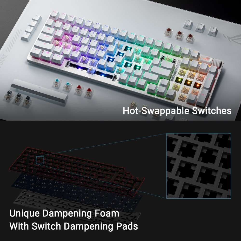 - Vylepšené možnosti písania: Predom namazané stabilizátory klávesnice produkujú menej trenia pre plynulejšie stlačenie kláves a stabilitu pre dlhšie klávesy; odolné krytky kláves ROG PBT doubleshot alebo krytky kláves ABS s UV vrstvou poskytujú prvotriedny pocit a odolnosť proti lesku