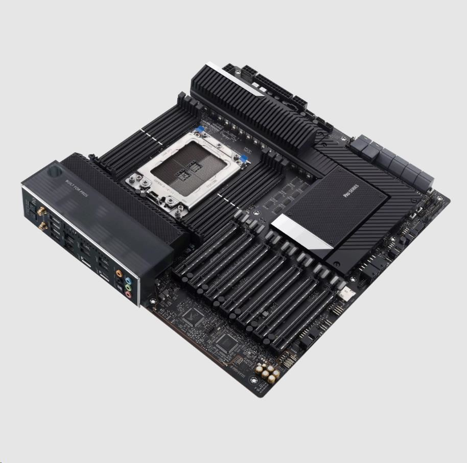 AMD WRX80 Ryzen™ Threadripper™ PRO extended-ATX workstation motherboard with Intel dual 10G LAN, USB 3.2 Gen 2x2 Type-C port, 7 x PCIe 4.0 x16 slots, 3 x M.2 PCIe 4.0, ASMB9-iKVM, 2 x U.2 and 16 power stages, and WIFI 6E