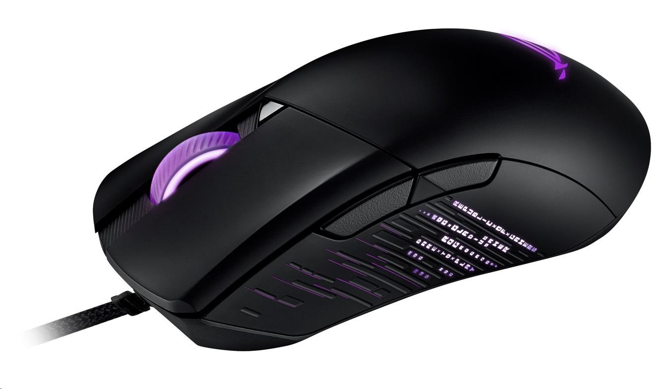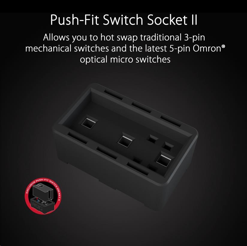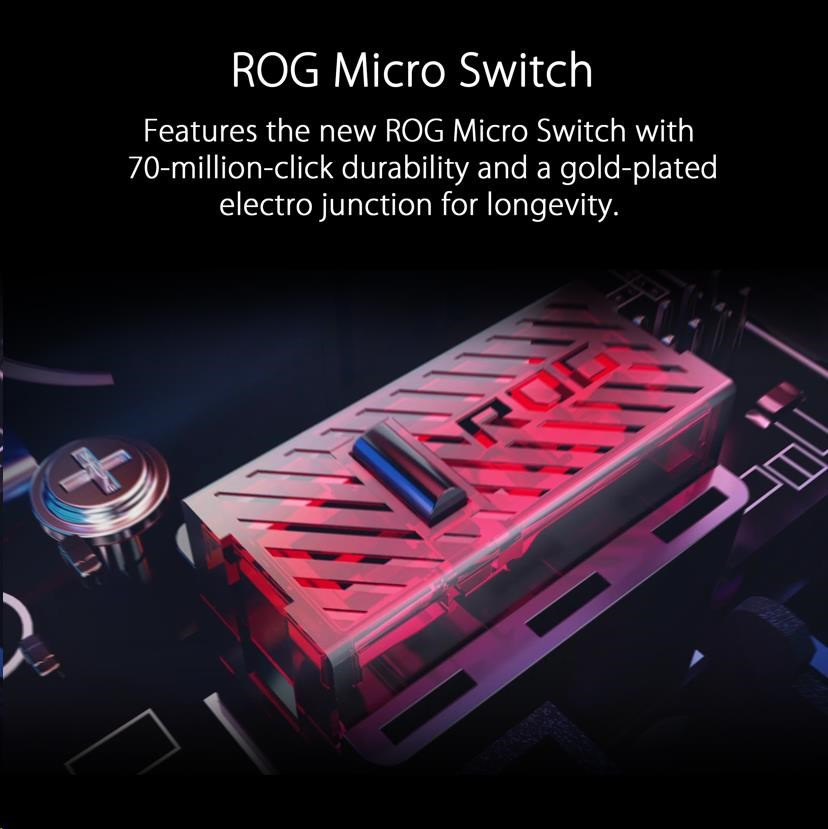 - ROG Micro Switches - Nové ROG Micro Switches majú životnosť 70 miliónov kliknutí a pozlátený elektrospoj na zvýšenie odolnosti. Prísne výrobné štandardy ROG zaručujú, že každý jednotlivý spínač je skontrolovaný a roztriedený, pričom sa spájajú ľavý a pravý spínač, aby sa udržala odchýlka sily v rozmedzí +/- 5 gramov pre konzistentný pocit kliknutia.