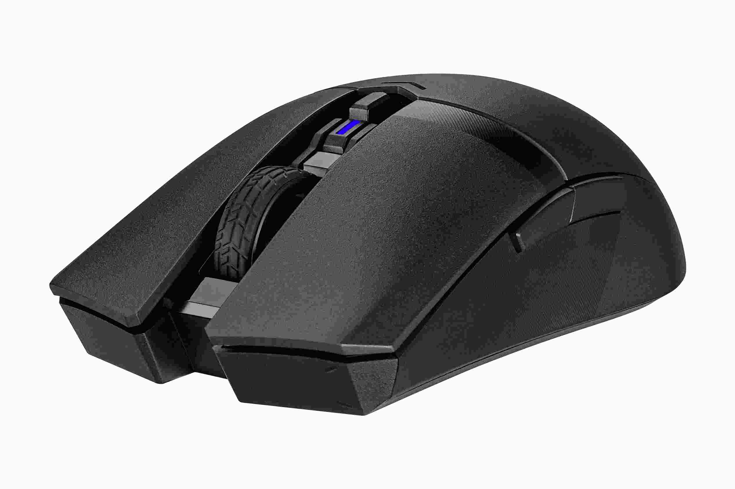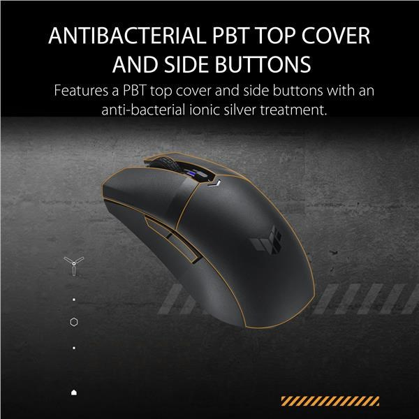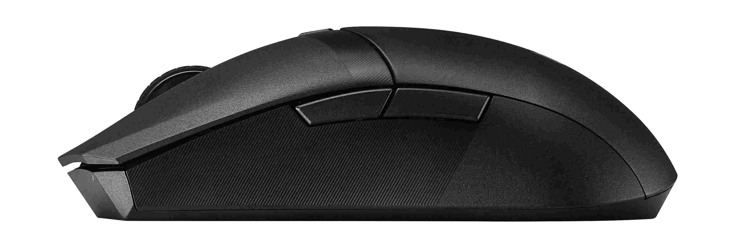 Ľahká obojručná herná myš s dvoma bezdrôtovými režimami, snímačom s rozlíšením 12 000 dpi, šiestimi programovateľnými tlačidlami, vrchným krytom PBT s antibakteriálnou ochranou ASUS, 100 % PTFE nožičkami a puzdrom Armoury Crate.