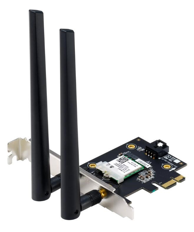 WiFi 6E PCI-E Adapter with 2 external antennas. Supporting 6GHz band, 160MHz, Bluetooth 5.2, WPA3 network security, OFDMA and MU-MIMO ASUS WiFi 6E total solution - optimized capabilities and performance All-new 6 GHz band - Less congestion and interference for WiFi connections Latest Bluetooth® 5.2 - improved signal range, faster transmit speeds and less interference Ultrafast WiFi 6 & WiFi 6E – 4.6X faster speeds, improved connection efficiency and better network security Reduced dead zones with external antennas - Adjustable antennas allows easy positioning for the best reception. Wi-Fi 6E (802.11ax) AXE5400 Tri-Band PCIe Wi-Fi Adapter MU-MIMO 160Mhz-Gigabit WiFi (2402Mbps) Bluetooth 5.2 Tri Band 2.4G & 5G & 6G.