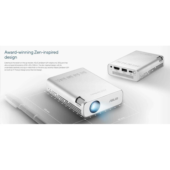 Mini LED projektor ASUS ZenBeam E1R – 200 LED lúmenov, rozlíšenie WVGA (854x480), režim automatickej projekcie na výšku, vstavaná batéria pre až 4-hodinové prenosné prehrávanie videa, powerbanka, USB Type-A, HDMI