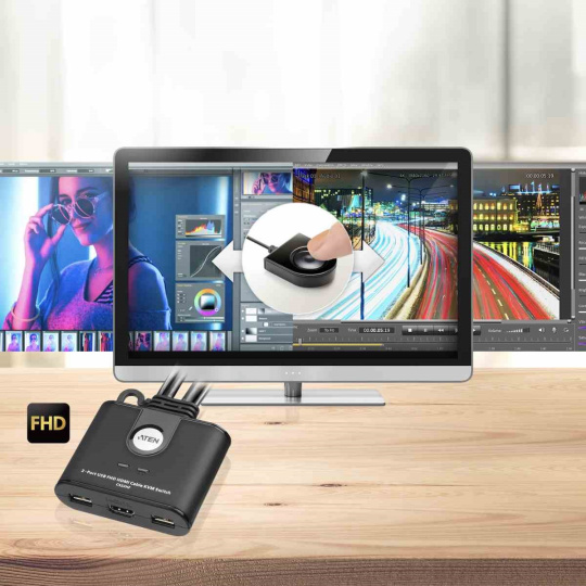 CS22HF ATEN 2-port HDMI KVM USB mini, integrované kabely, tlačítko pro přepínání CS22HF 2-Port USB FHD HDMI kabel KVM Switch je řídící jednotka, která umožňuje přístup ke dvěma počítačům z jedné USB a HDMI konzole a zároveň nabízí kvalitu videa až 1920 x 1080 @ 60 Hz / 1920 x 1200 @ 60 Hz. S CS22HF můžete rychle a bez námahy přepínat mezi dvěma USB HDMI počítači pomocí tlačítka na dálkovém voliči portů. CS22HF podporuje multiplatformní operace, které vám umožňují přepínat mezi dvěma různými počítači s operačním systémem. Kompaktní design napájený ze sběrnice navíc umožňuje efektivní a organizovanou instalaci a poskytuje ideální řešení šetřící místo, aby byl váš stůl dobře uspořádaný. Tento přepínač plug and play je ideální pro lidi, kteří potřebují rychlé ovládání pro multitasking mezi dvěma počítači na ploše v jakémkoli prostředí. Funkce - Jedna KVM konzole ovládá dva počítače s rozhraním USB a HDMI - Vynikající kvalita videa – až 1920 x 1080 při 60 Hz / 1920 x 1200 při 60 Hz - Výběr počítače pomocí Remote Port Selector - Kompatibilní s HDMI; Vyhovuje HDCP 1.4 - Multiplatformní podpora – Windows, Mac a Linux - Porty USB konzoly lze použít pro sdílení periferií USB - Podporuje USB hot-plugging - Napájený ze sběrnice USB.