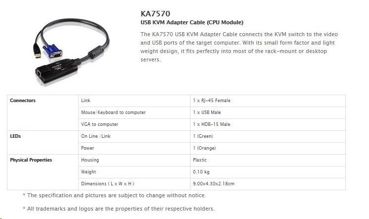 | Konektory | USB samec typu A 1x VGA samec 1x 1x RJ-45 na pripojenie ku KVM |