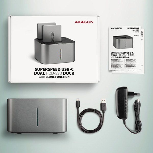 Dokovacia / klonovacia stanica SuperSpeed USB-C 5 Gb/s AXAGON ADSA-DC DUAL CLONE pripojí k počítaču rýchlo a jednoducho až dva 2,5" alebo 3,5" disky. Pripojenie k počítaču umožňuje moderný obojstranný USB-C konektor na doku spolu s dodávaným USB-C <-> USB-A káblom s dĺžkou 80 cm.