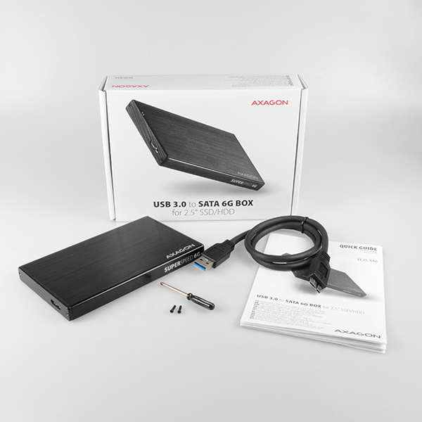 Kompaktný hliníkový externý box AXAGON EE25-XA6 ALINEbox s USB 3.0 a SATA 6G rozhraním určený pre 2.5" SATA pevné disky alebo SSD.