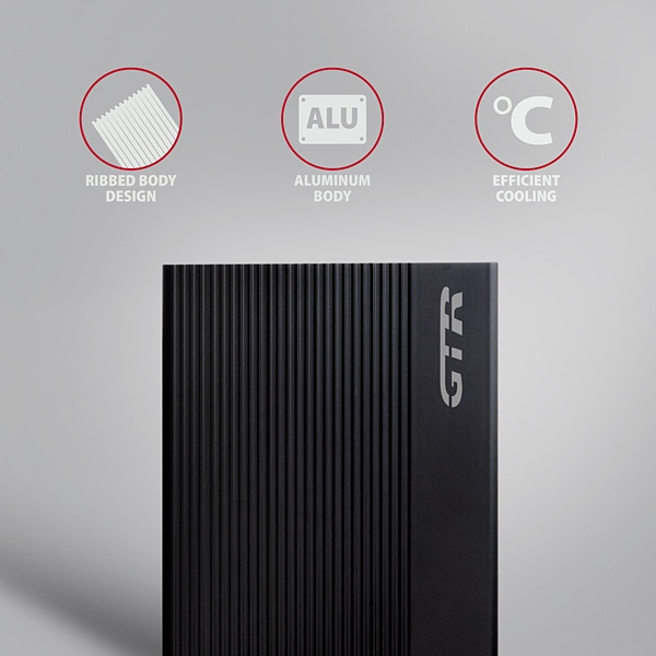 Vnútorný rám škatule dobre fixuje a chráni vložený disk. Rebrované hliníkové telo boxu pomáha chladiť a chrániť disk. Gumové popruhy znižujú kĺzanie po stole. Elegantný povrch boxu zabraňuje nežiaducim odtlačkom prstov.