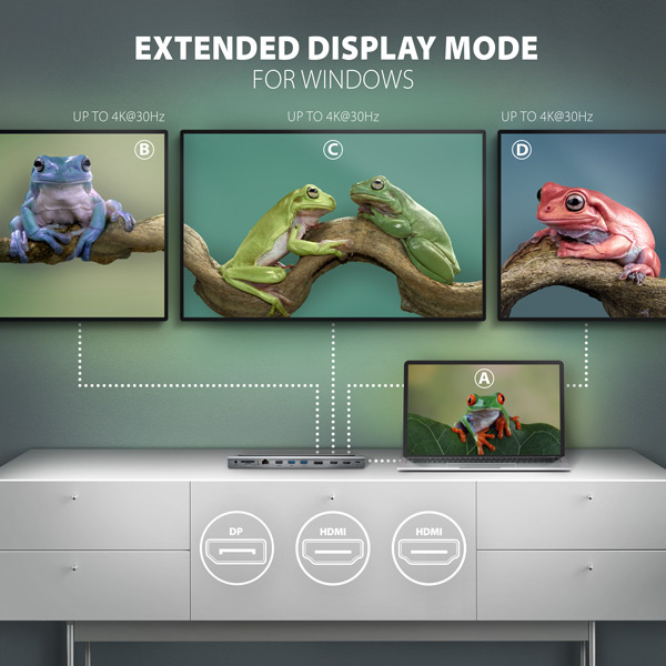 Každý z troch video výstupov (2x HDMI + 1x DisplayPort) poskytuje vysokokvalitný obraz až do 4K/60Hz Ultra HD. Vysoké frekvencie sú podporované aj v populárnych herných rozlíšeniach 2K/144Hz alebo FullHD/240Hz. Aj pri pripojení troch monitorov súčasne dokáže dokovacia stanica poskytnúť rozlíšenie až 4K/30Hz na každom z nich. Vďaka podpore HDR (High Dynamic Range) si môžete vychutnať výrazne rozšírenú škálu farieb a kontrastov bez obmedzení. Aby video výstup fungoval správne, port USB-C prenosného počítača musí podporovať alternatívny režim DisplayPort (DP Alt Mode) alebo Thunderbolt 3/4. Podpora vyššie uvedených maximálnych podporovaných rozlíšení a frekvencií vyžaduje pripojenie k počítaču s DisplayPort verzie 1.4.