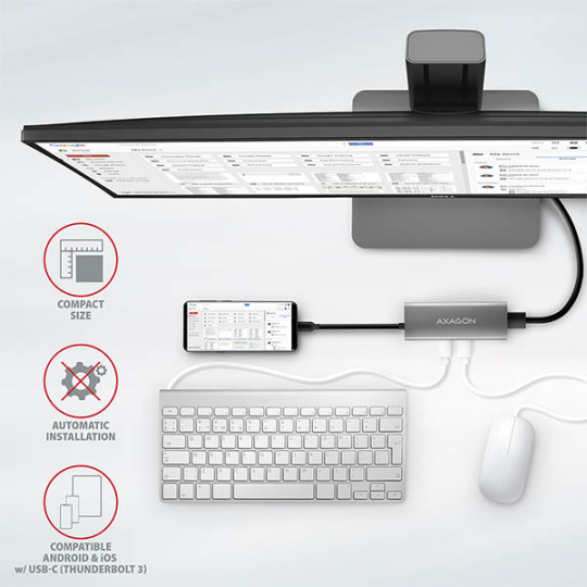 USB-C hub je ideálnym doplnkom pre notebooky bez USB-A konektorov a video výstupu. Možno tak využiť Vaše existujúce USB periférie bez nutnosti zaobstarávania nových. Vďaka funkciám Plug and Play a Hot Plug je samotné zapojenie hubu veľmi jednoduché bez zložitej inštalácie, a taktiež je možné jednoducho pripájať a odpájať periférie za behu počítača. Rozbočovač sa nezľakne ani pripojenie k telefónom s USB-C konektorom. K telefónu tak pripojíte napríklad flash disk, klávesnicu, myš, monitor, TV alebo projektor.