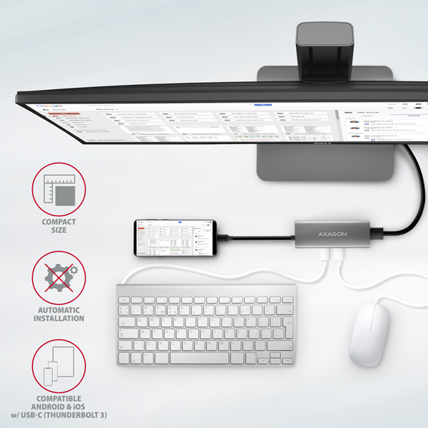 USB-C hub je ideálnym doplnkom pre notebooky bez USB-A konektora a video výstupu. Tak môžete využiť vaše existujúce USB periférie bez nutnosti kupovať nové. Vďaka funkcii Plug and Play a Hot Plug je samotné zapojenie hubu veľmi jednoduché bez zložitých inštalácií, a tiež je možné ľahko pripojovať a odpojovať periférie za chodu počítača. Rozbočovač sa nebojí ani pripojenia k telefónom s USB-C konektorom. K telefónu tak môžete pripojiť napríklad flash disk, klávesnicu, myš, monitor, TV alebo projektor.