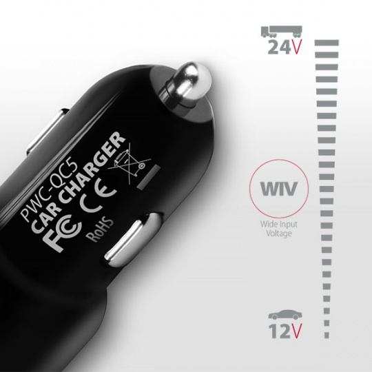 Univerzálna USB auto nabíjačka AXAGON PWC-QC5 pre rýchle nabíjanie až dvoch mobilných zariadení súčasne.