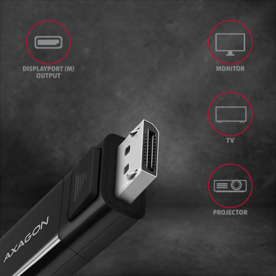Aktívny USB-C -> DisplayPort kábel - redukcia AXAGON RVC-DPC pre pripojenie DisplayPort monitora/TV/projektora k notebooku alebo telefónu pomocou USB-C konektora.