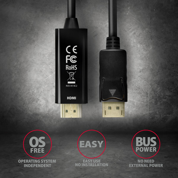 DisplayPort -> HDMI aktívny kábel - adaptér AXAGON RVD-HI14C2 na pripojenie HDMI monitora/TV/projektora k počítaču s výstupom DisplayPort.
