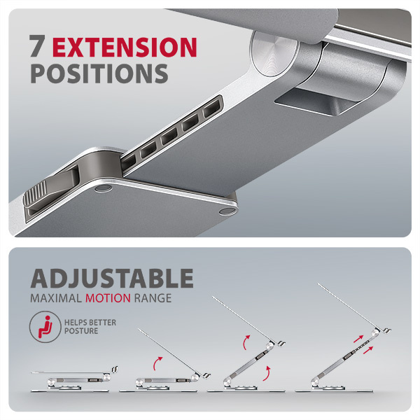 Jedinečnou vlastnosťou je výsuvné rameno s uvoľňovacím zámkom , ktoré umožňuje jeho predĺženie až o 6 cm vďaka siedmim nastaviteľným polohám. Notebook si tak ľahko nastavíte do optimálnej výšky a vzdialenosti od očí presne podľa vašich potrieb. Šikovné riešenie s dvoma pántmi poskytuje plynulé nastavenie výšky obrazovky tak, aby bolo v jednej rovine s externým monitorom. Získate tak ďalšiu pracovnú plochu v správnej úrovni očí, čo výrazne zlepšuje ergonómiu, zvyšuje komfort a zároveň podporuje vašu produktivitu.