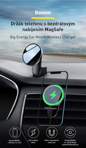 Kvalitný a elegantný magnetický držiak na mobilný telefón s?bezdrôtové nabíjanie, ktoré je kompatibilné s?séria iPhone 12 vybavená MagSafe. Samozrejmosťou je maloobchodné balenie.