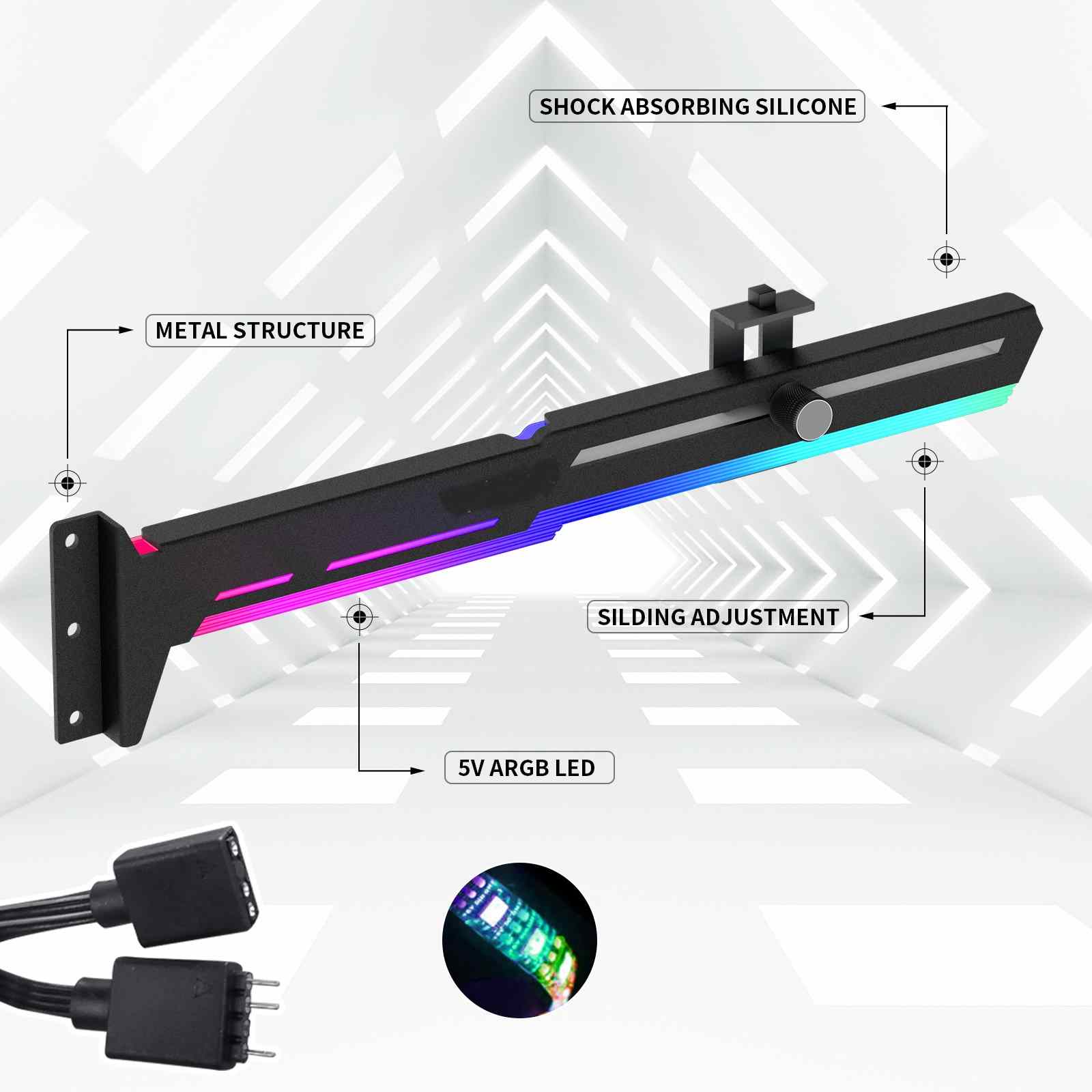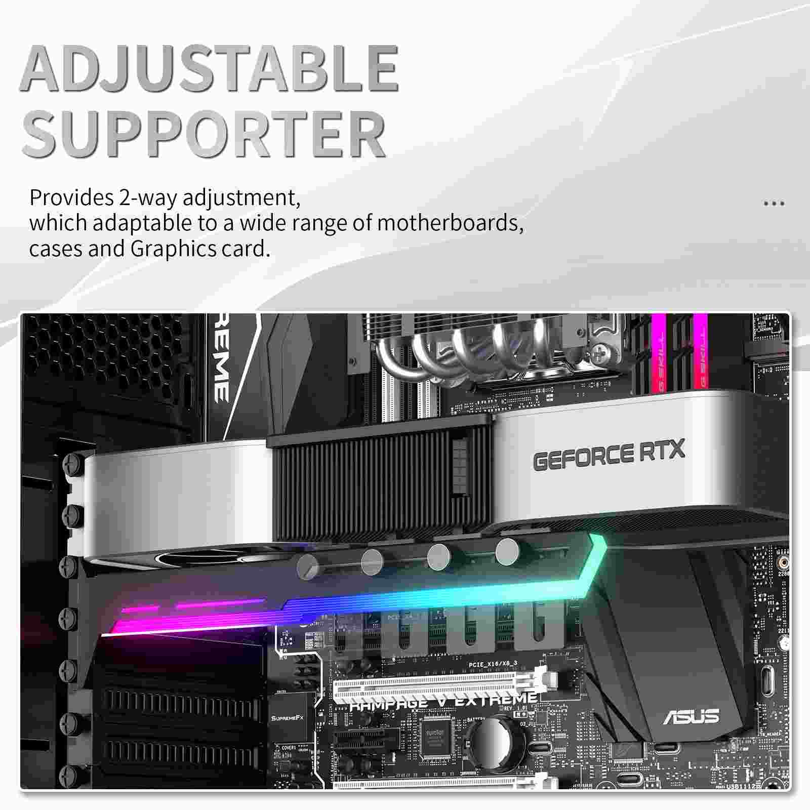 Štýlová varianta tejto opory vašej grafickej karty je vyrobená z oceľového práškového lakovaného plechu a plastu, zabraňuje prehnutiu väčších kariet v slotu a dodáva tak zostave lepšiu celkovú stabilitu. Súčasťou je silikónová posuvná opora, ktorú je možné posunúť horizontálne aj vertikálne a umožňuje inštaláciu na rôznych miestach karty, pre maximálnu kompatibilitu s väčšinou kariet. Rozmery držiaku sú 280 x 52mm.