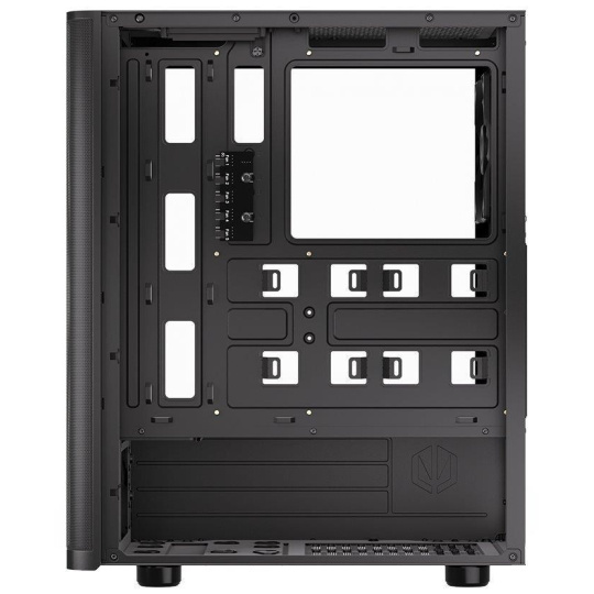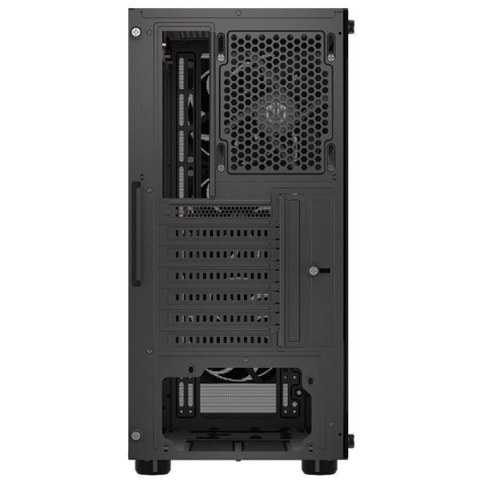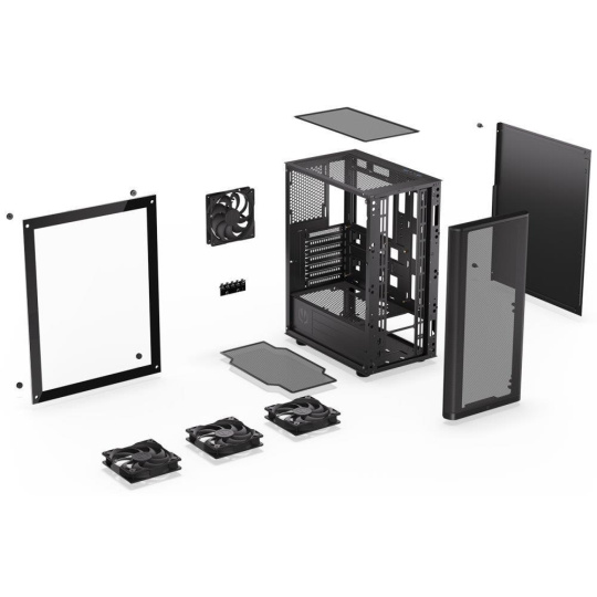 Skriňa formátu Middle Tower s priehľadnou bočnicou z tvrdeného skla ponúka dve 2,5" pozície pre SSD disky a jednu 3,5" pozíciu pre pevný disk. Na hornom okraji sa nachádza dva USB 3.0 porty, slúchadlový výstup a audio vstup pre mikrofón. Vybavená je štyrmi 120 mm ventilátormi, ktoré spolu s perforovaným čelným panelom zabezpečujú dostatočné prúdenie vzduchu. Promyšlené riešenie umožňuje pohodlné umiestnenie az 360 mm dlhého výmenníka vodného chladenia na prednej strane. Vo skrini je dostatok priestoru pre chladič CPU do výšky až 161 mm a grafickú kartu s dĺžkou až 315 mm. Dodáva sa bez zdroja. Súčasťou je tiež sada prachových filtrov.