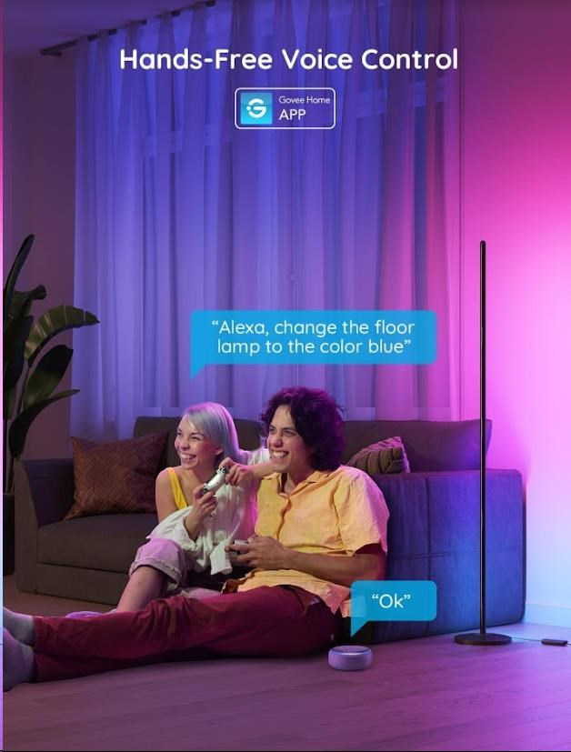 Lampa Govee Smart Corner Floor Lamp je kompatibilná s asistentmi Alexa, Google Assistant a Siri. Teraz môžete Govee Smart Corner Floor Lamp zapnúť/vypnúť, upraviť úroveň jasu alebo zmeniť ich farbu pomocou hlasových príkazov z pohodlia vašej pohovky alebo postele. Ovládanie lampy je možné tiež priamo na paneli alebo cez aplikáciu vo vašom smartfóne alebo tablete.