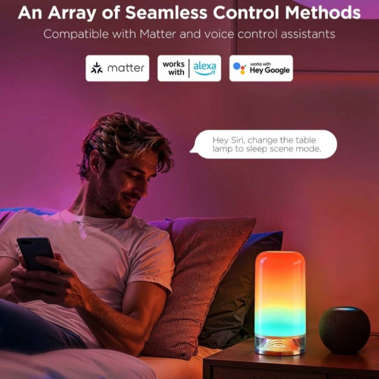 Ovládanie Govee LED Table Lamp 2 je úplne bezproblémové vďaka šikovnej aplikácii Govee Home, ktorá umožňuje jednoducho meniť farby, nastavovať svetelné efekty a dokonca vytvárať vlastné svetelné návrhy v režime DIY. Lampa je tiež kompatibilná s hlasovými asistentmi, ako sú Amazon Alexa a Google Assistant, čo vám umožní ovládať osvetlenie len hlasovým príkazom. Vďaka protokolu Matter ju možno ľahko začleniť do akéhokoľvek systému Smart Home, napríklad Homekit. Navyše ponúka možnosť nastavenia časovača a automatického vypnutia, takže máte nad osvetlením plnú kontrolu.