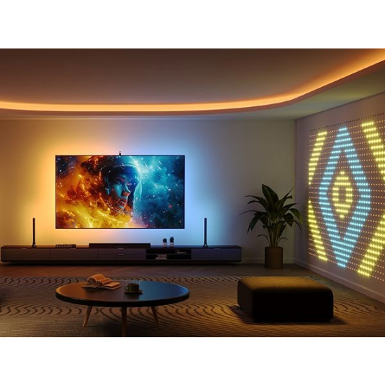 Súprava osvetlenia sa spolieha na fotoaparát, ktorý presne reprodukuje farby na obrazovke. To je teraz rozšírené o korekciu skreslenia, takže podsvietenie presne kopíruje farby na obrazovke a vytvára tak pohlcujúci vizuálny zážitok. Kamera je umiestnená nad televízorom, aby bola kompatibilná so soundbarmi a prispôsobila sa aj modelom s ultratenkou obrazovkou.